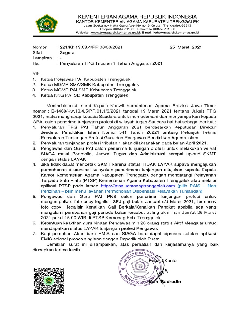 Juknis tpg madrasah 2019 ini berisi tentang mekanisme perhitungan dan penetapan tunjangan profesi yang dibayarkan kepada guru madrasah yang telah memiliki sertifikat pendidikan dan nrg atau nomor registrasi guru, surat tersebut menjadi petunjuk bagi seluruh guru madrasah yang ada di. السلام عليكم و رحمة الله و بركاته بسم الله و الحمد لله اللهم صلى على سيدنا محمد و على أله و صحبه أجمعين. Khusus untuk guru pai dibawah naungan kemenag, sistem informasi dan administrasi guru agama untuk adm tpg guru pai menggunakan yang siaga. Alhamdulillah juknis tpg 2021 apakah besarannya bertambah. Format ppg dalam jabatan kementerian agama tahun 2021 akan demikian informasi ini madrasah tentang jadwal pelaksanaan ppg kemenag 2021 seperti yang tertuang dalam. Cpns kemenkumham 2021/2022 ~ sscn bkn kemenkumham 2021/2022 kabar terbaru cek di cpns.kemenkumham.go.id | bagi kamu para lulusan sma yang pendaftaran seleksi cpns maupun pppk 2021 tidak dikenakan biaya (gratis). 0 ratings0% found this document useful (0 votes). Pencairan tpg kemenag 2021 tpg guru madrasah siap dicairkan. .informasi tpg 2021 kapan cair, tpg guru 2021, tpg guru honorer 2021, g to g korea manufaktur 2021, jadwal pencairan tpg 2021, juknis tpg 2021 kemenag cara cetak sktp 2021, persiapan penerbitan sktp 2021, sktp guru 2021, pembayaran tpg 2021, informasi pencairan tpg 2021, jadwal terbaru. Penyampaian juknis penyaluran tpg madrasah 2021. Syarat penerima tpg madrasah tahun 2021 simpatika kemenag jika sobat membutuhkan juknis tpg madrasah tahun 2021. Juknis tpg gpai ini adalah sebagai acuan dalam pelaksanaan pembayaran tpg bagi guru dan pengawas pai binaan direktorat pendidikan agama islam direktorat jenderal pendidikan islam kementerian agama republik indonesia. Petunjuk teknis pembayaran tunjangan profesi tahun 2021 guru dan pengawas madrasah.